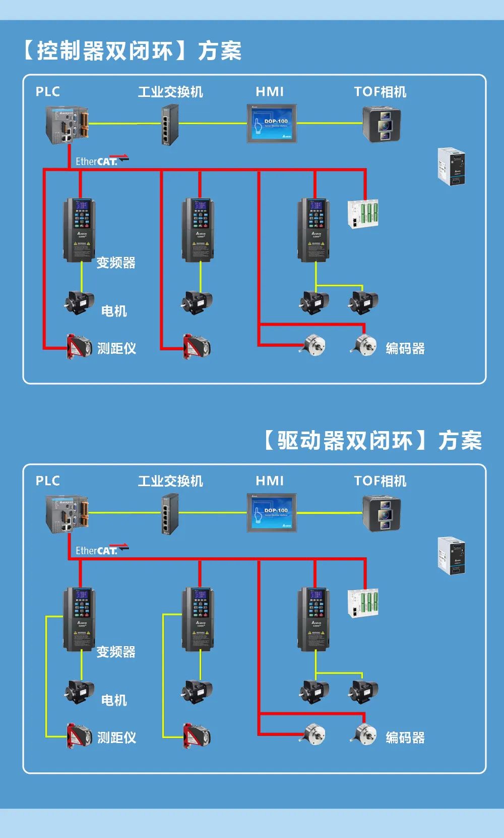 臺達堆垛機方案,建立在優秀的自動化產品之上。臺達高性能 C2000+變頻器搭配 PLC、HMI、工業交換機、開關電源、測距儀以及全新的 3D TOF 智能相機。