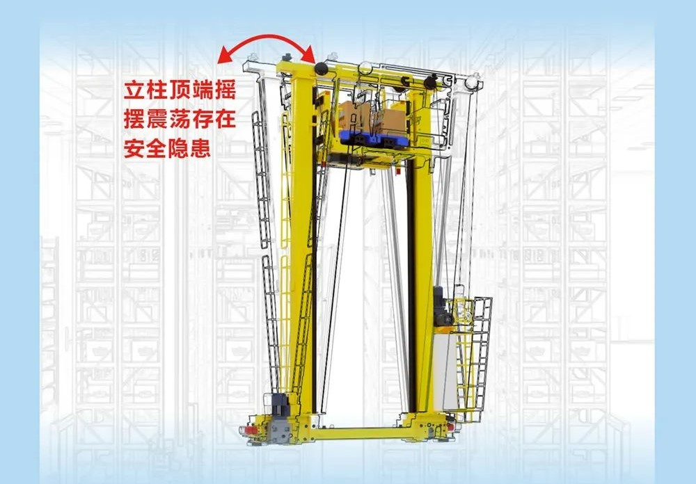 當倉儲貨架層數較多時,堆垛機的高度也相應增高,堆垛機立柱的擺動也越明顯。尤其是當大負荷快速運行時,立柱的搖擺振蕩甚至會危及系統安全。